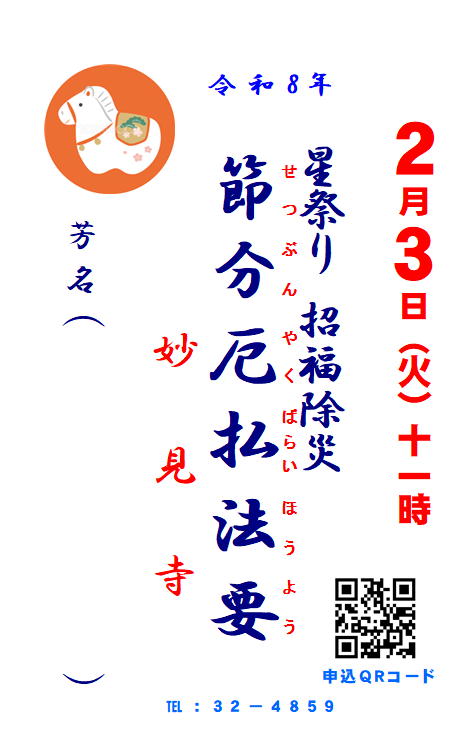令和8年節分厄払い法要のお申し込みはこちらです。 厄除け御札・福豆進呈 皆さんお揃いでお参り下さい。
